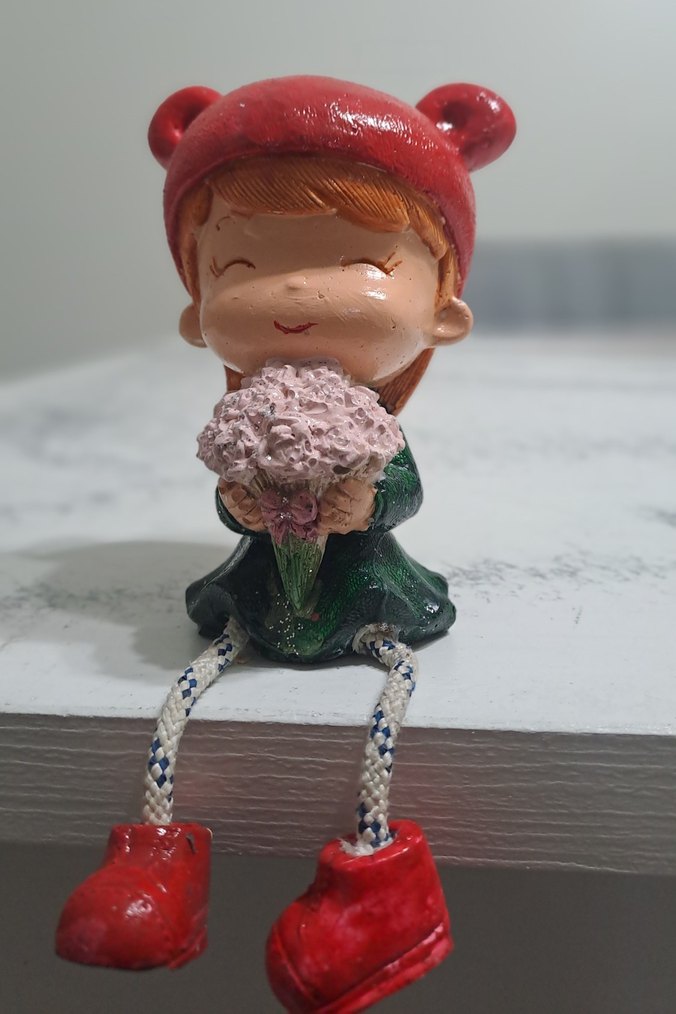 12 cm boyu Pembe şapkalı, çiçek buketi tutan ve kırmızı ayakkabılı renkli bir çocuk figürini.