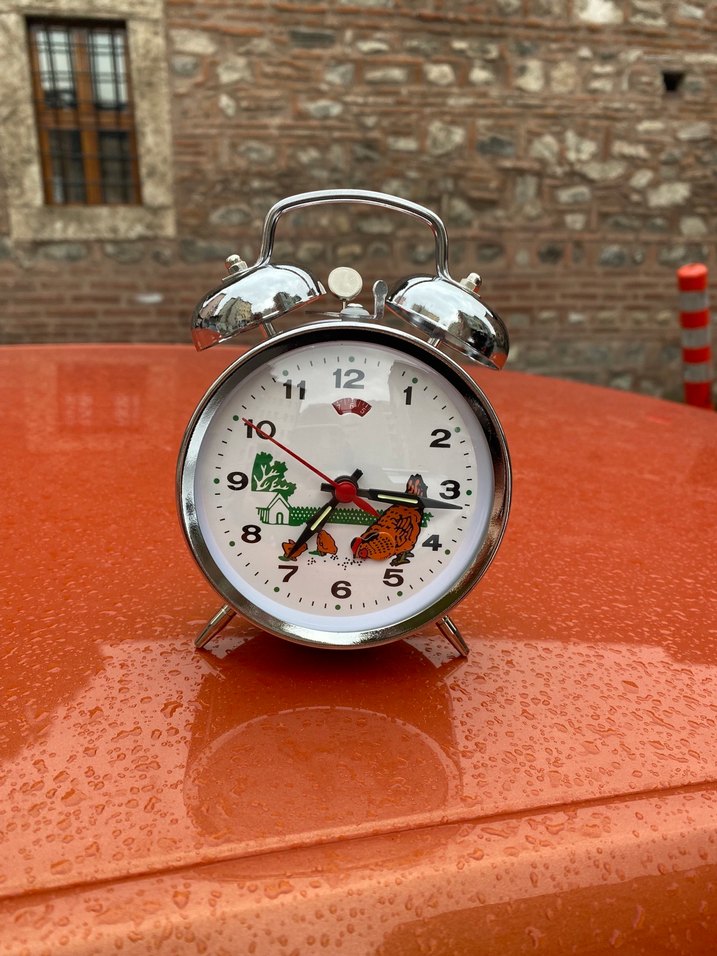 Turuncu tabanlı, renkli illüstrasyonlu beyaz kadranlı klasik çift zilli masa saati. Vintage tarz ve canlı renkler bir arada. ⏰
