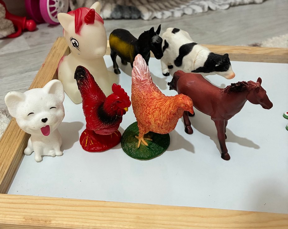 Renkli detaylara sahip, tek boynuzlu at, at, inek, horoz ve tavuk figürlerinden oluşan çiftlik hayvanları seti.
