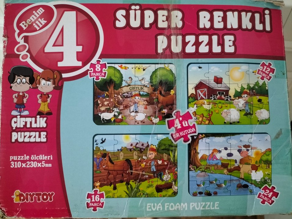Kutusunda görüldüğü gibi 8-12-16-24 parça olmak üzere 4 adet Eva köpük puzzle dan oluşuyor. Örnek olması üzere 8 parçalı olanı yapıp koydum. Eksik parçası yoktur. Kutulu ancak kutunun kapak kısmında yırtılma var görsele ekledim.
