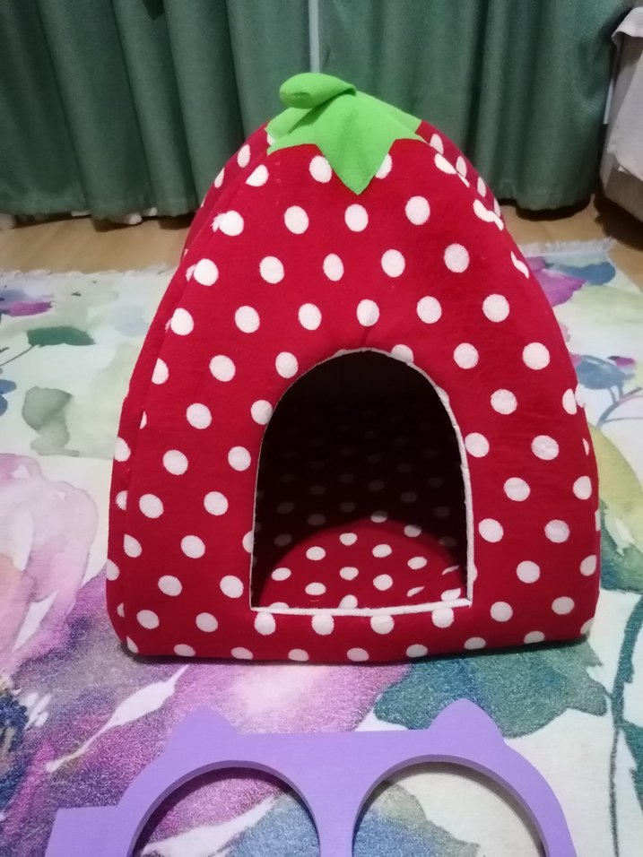Kırmızı beyaz puantiyeli, yeşil yapraklı renkli çilek şeklinde kedi evi, kediler için rahat bir alan sunar. Defosu fotoda belirtildi