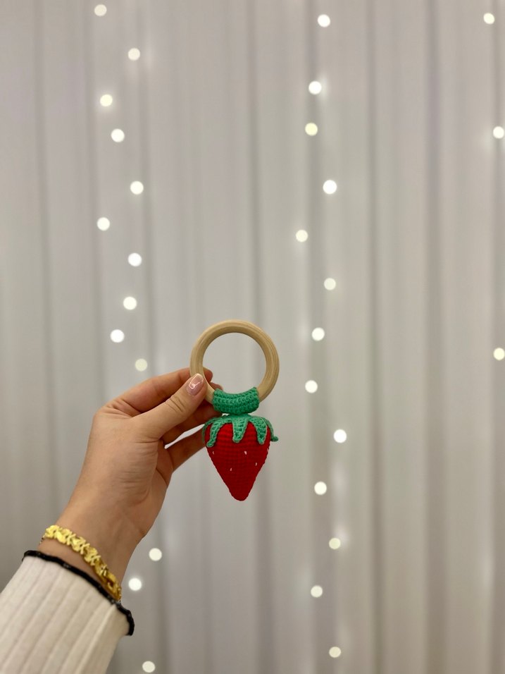 Ahşap halkalı, yumuşak örme çilek figürlü renkli diş kaşıyıcı ve çıngırak.