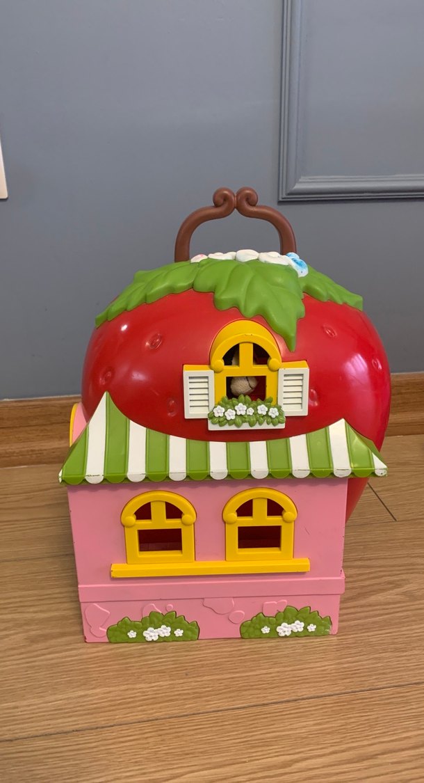 Renkli çilek şeklinde oyuncak ev, pembe taban, yeşil çizgili tente ve sarı pencere çerçeveleri ile. Taşıma sapı ve çiçek detayları bulunur.