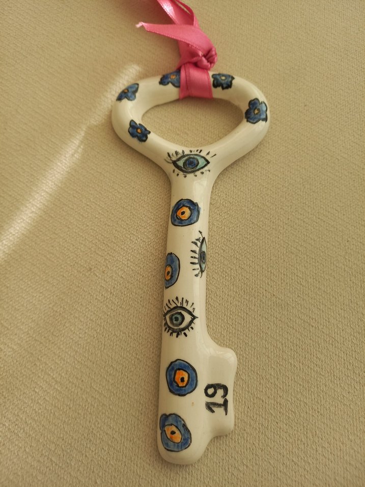 Göz motifleri ve pembe püskülü ile renkli vintage tarzı anahtarlık, bohem ve retro havası taşıyor. ️