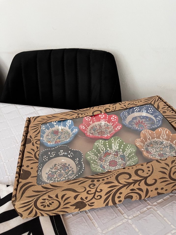 Altı renkli, geleneksel desenlere sahip el yapımı seramik kase seti, dekorasyon veya sunum için uygundur.
