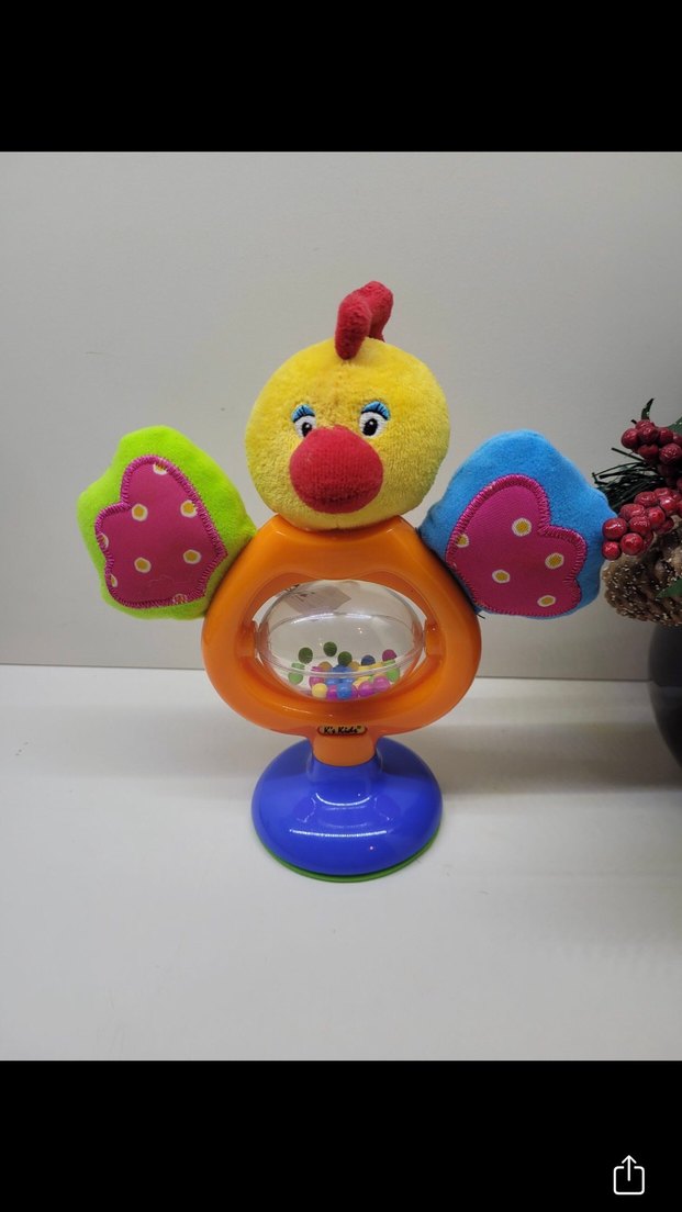 Yumuşak kanatlı, çıngıraklı ve renkli civciv şeklinde diş kaşıyıcı oyuncak.