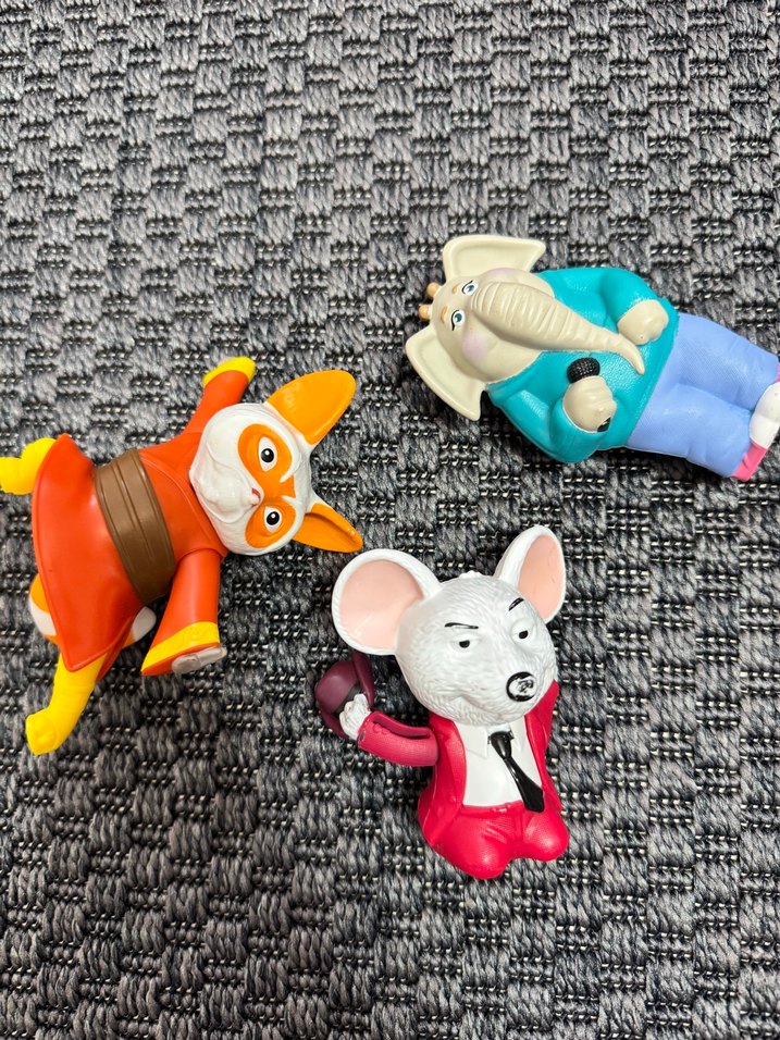 Kırmızı takım elbiseli fare, mavi elbiseli fil ve turuncu tilki figürleri içeren renkli çizgi film karakterleri aksiyon figürleri.