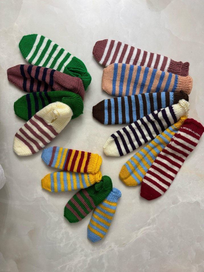 Bay-Bayan Gerçek el işi çoraplar her biri en az 2-3 gün süren, çeşitli canlı renklerde çizgili renkli çoraplar. Rahat ve sıcak tutar. Büyük boylar standart 400 TL , küçük boylarda çocuklar için standart 200 tl tekrar ayak numaranızı bildirebilirsiniz. 1. kalite işçilik ve malzemeden yapılıyor.