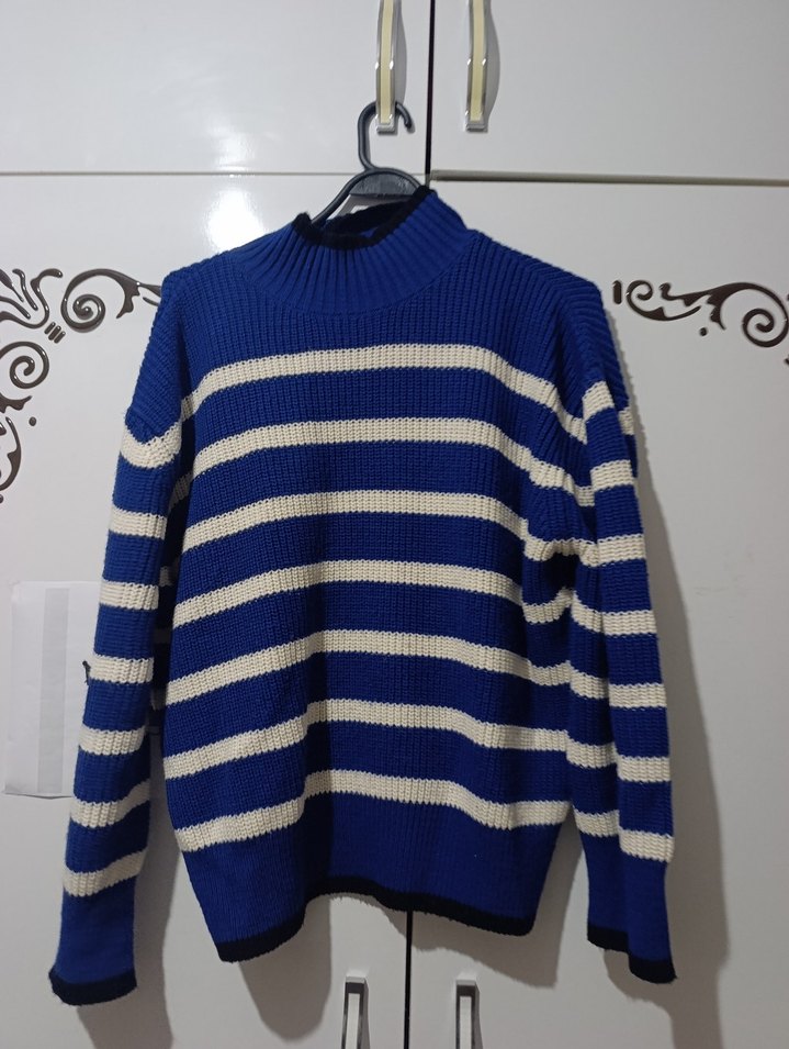 Renkli çizgili, boğazlı ve uzun kollu triko kazak, rahat kesimiyle günlük sokak stili için uygundur.