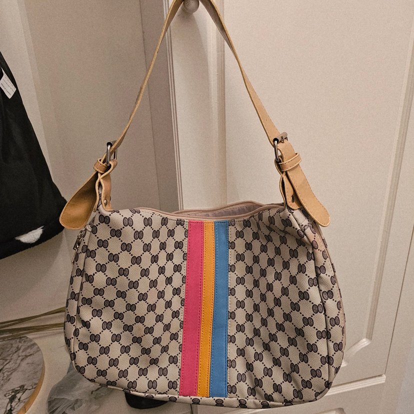 Kadınlar için baskılı desenli, pastel renkli çizgili, tokalı askılı, sentetik kumaştan günlük sokak stili omuz çantası.