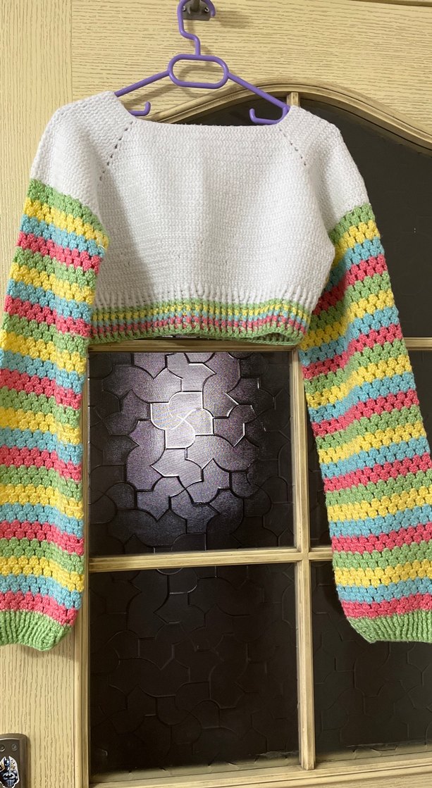 Renkli çizgili uzun kollu, bol kesim triko kazak. Kayık yaka ve rahat bohem tarzıyla günlük kullanıma uygun. El yapımıdır