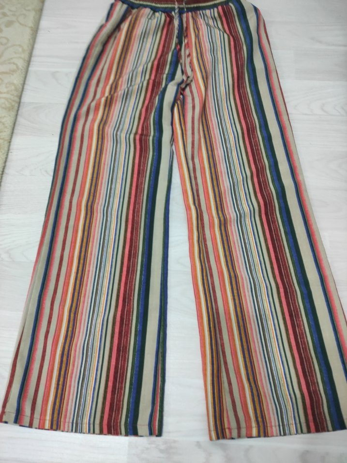 Kadınlar için uzun boy, renkli çizgili ve pileli kumaş pantolon. Bol kesimiyle bohem tarzında,. Günlük kullanıma uygundur.
