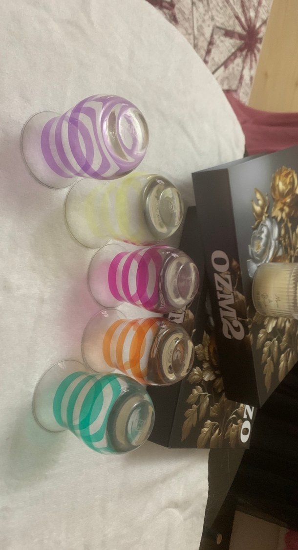 Hafif tonlarda renkli spiral çizgili cam bardak seti. Her bardakta farklı renk bulunur, masa düzeninize canlılık katar. Çizgilerinde hafıf soyulma var