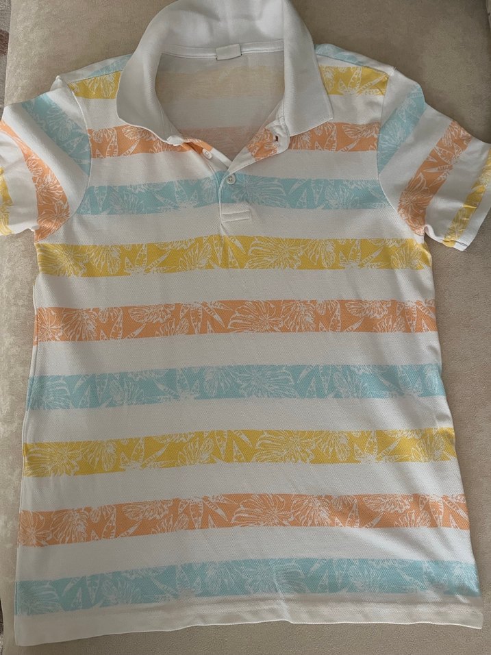 Yumuşak pamuklu, kısa kollu, düğmeli ve yakalı, renkli çizgili rahat kesim erkek çocuk tişörtü. Günlük sokak stili için uygundur.