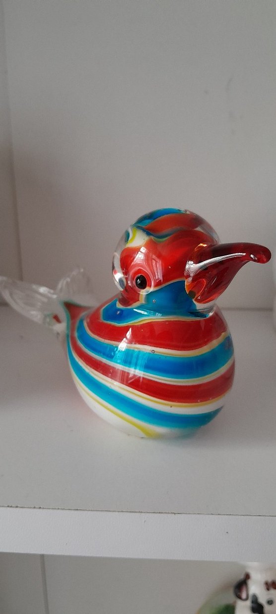 Canlı kırmızı, mavi ve sarı çizgilerle süslenmiş, parlak yüzeyli renkli cam kuş biblosu. El yapimidir..2500 tl fiyati vardi