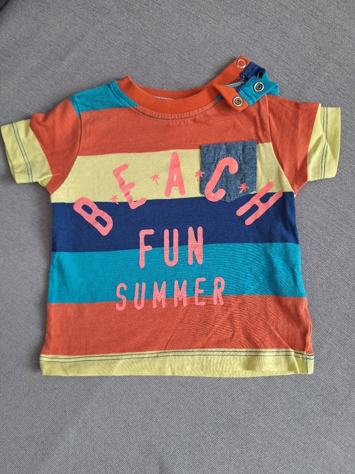 Renkli çizgili, bol kesim, düğmeli bisiklet yaka erkek çocuk kısa kollu tişört. Yaz temalı baskı içerir.