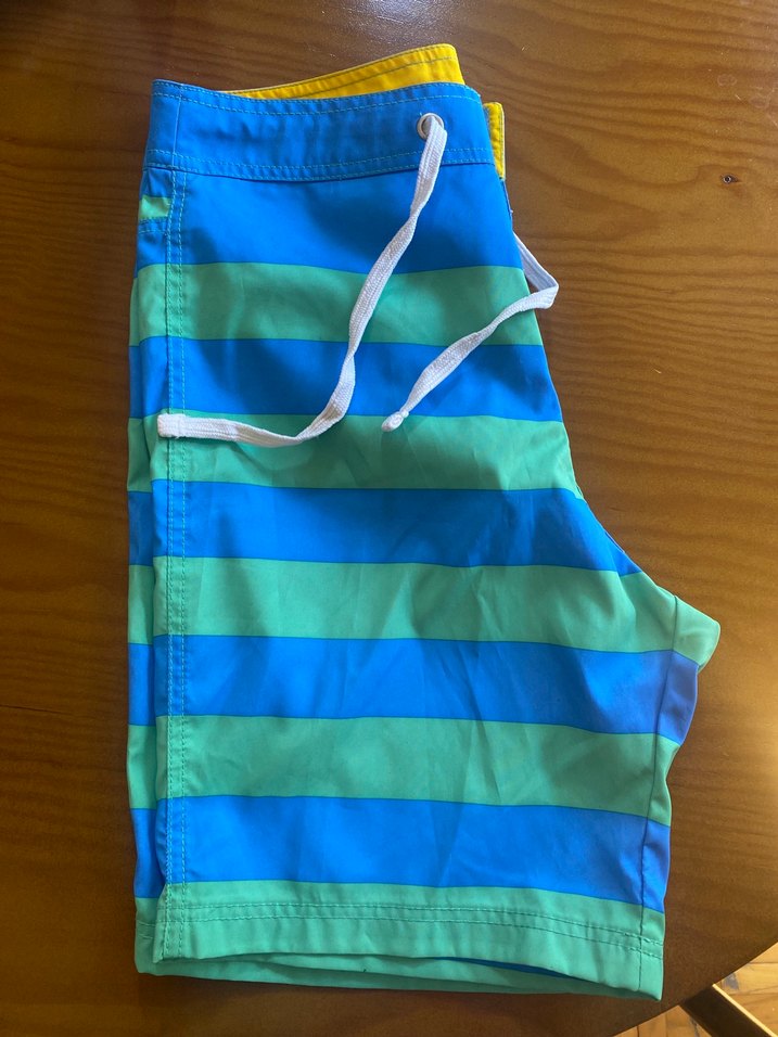 Renkli yatay çizgili, beach ve streetwear athleisure tarzında erkek fitted midi mayo, boy 50cm..