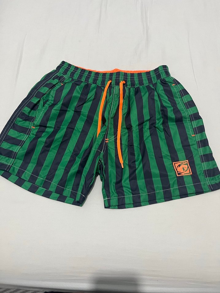 Renkli yeşil ve siyah çizgili, kemerli ve turuncu bağcık detaylı erkek şort. Plaj ve günlük sokak stili için uygun.