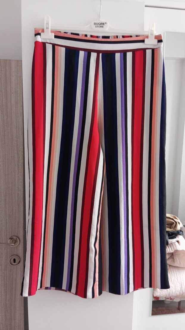 Kadınlar için bol kesim, renkli dikey çizgili ve pile detaylı sentetik kumaştan uzun pantolon. Günlük sokak stili için uygun.