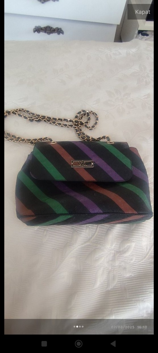 Koyu renkli, çok renkli çizgili, tokalı kapaklı ve zincir askılı omuz çantası. Bağlama boyası deseni ile sokak tarzına uygun, günlük kullanıma ideal.