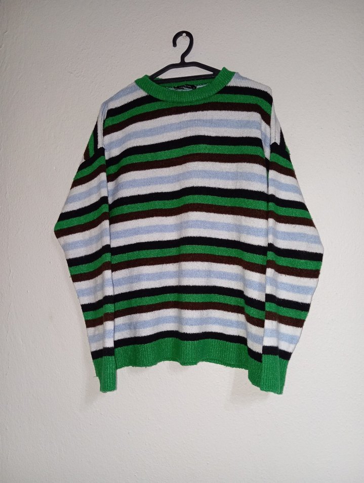 Renkli yatay çizgilerle örülmüş, uzun kollu ve yuvarlak yakalı kadın triko kazak. Rahat kesimiyle günlük kullanıma uygundur. iki kol arası 55 cm boy 60 cm