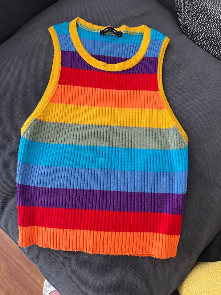 Renkli çizgili, fit kesim, kolsuz kadın süveter. Triko kumaştan, normal midi boyda, yuvarlak yaka ile günlük kullanıma uygun. Trendyol