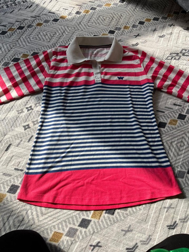 Renkli çizgili, kısa kollu, yakalı ve düğmeli erkek polo tişört. Pembe, beyaz ve lacivert çizgilerle, rahat ve sokak tarzı için uygun.