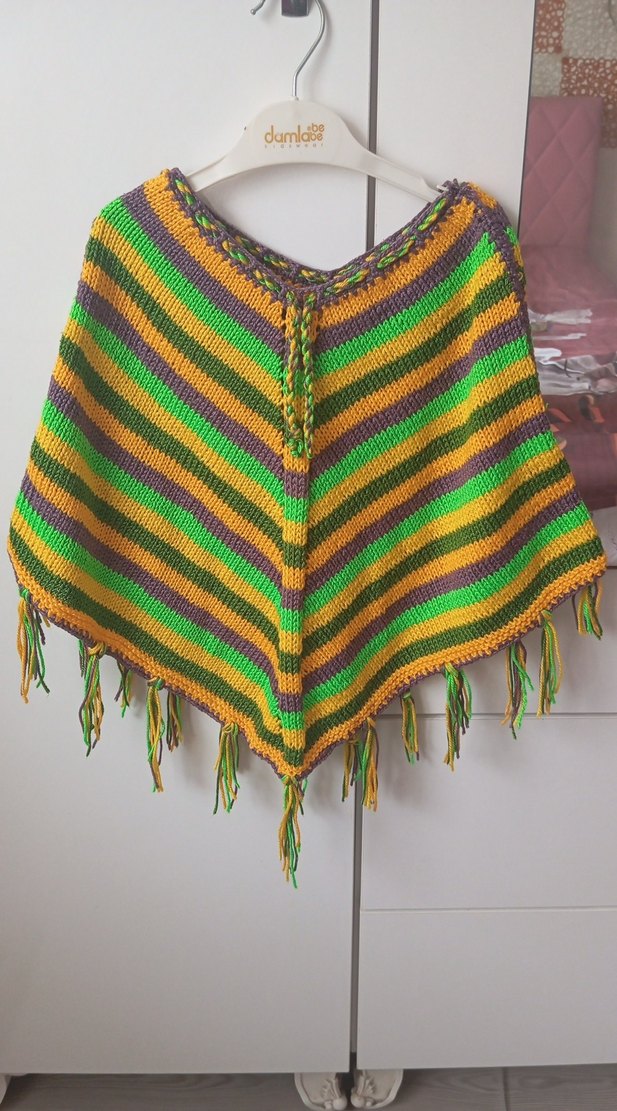 Renkli çizgili, bol kesim kız çocuk pançosu, tekne yaka ve Yumuşak örgü kumaştan yapılmış, püsküllü uçlarıyla bohem tarzını yansıtır. Renkleri çok canlıdır fotoğrafdan doluyo soluk gibi görünmüş