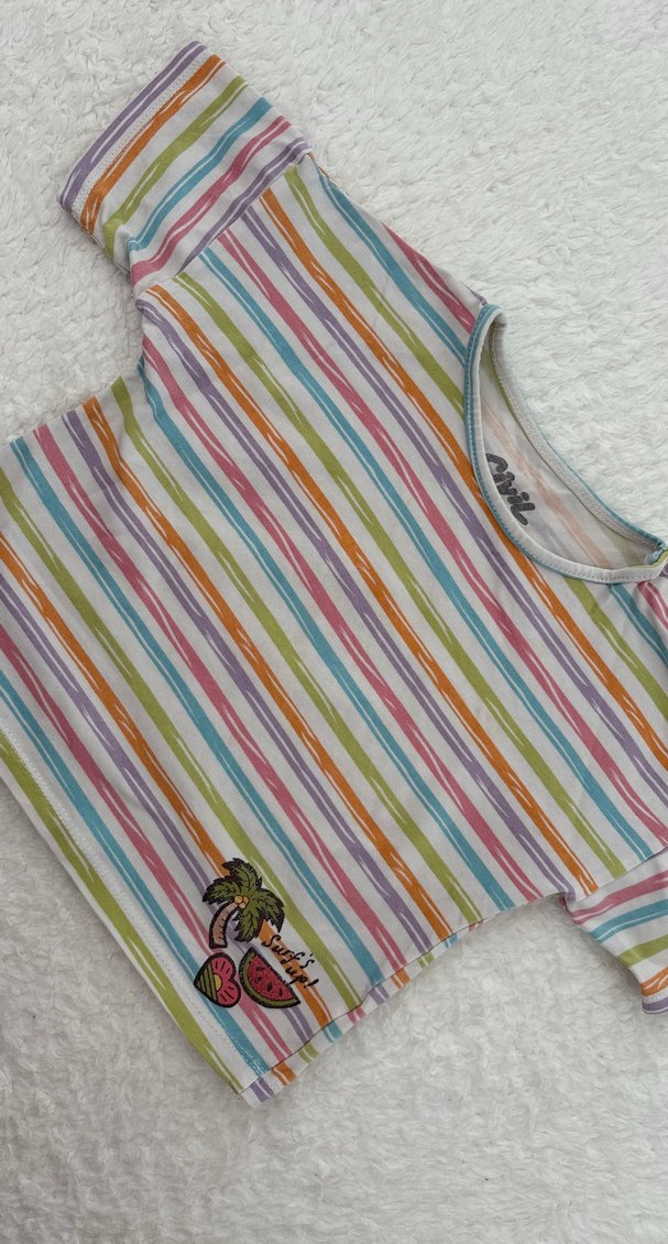 Rahat kesim, kısa kollu, kayık yaka kız tişörtü, renkli çizgiler ve küçük baskılı detaylı, düğmeli tasarım.
