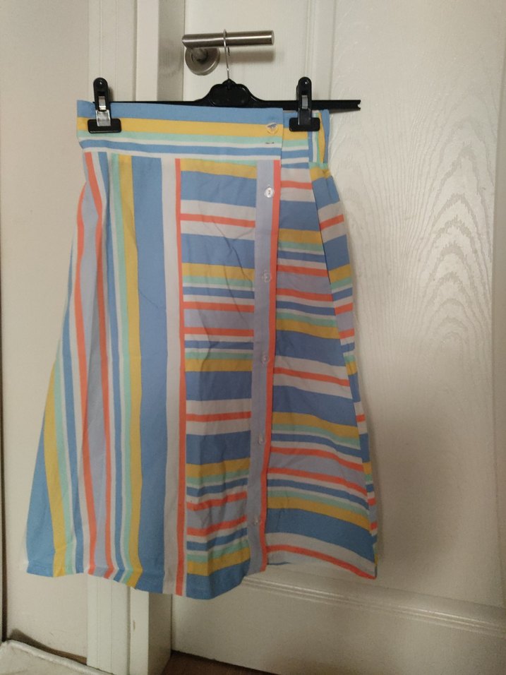 Bu midi etek, yumuşak pamuk kumaştan yapılmış, bol kesim ve pastel çok renkli çizgilerle tasarlanmıştır. Günlük kullanım için uygundur.
