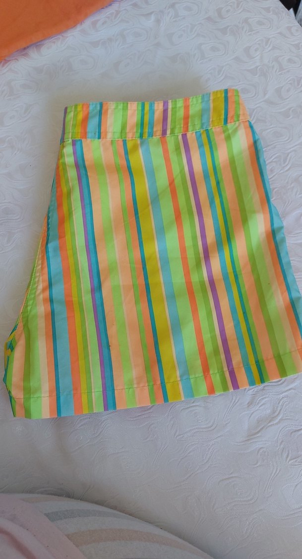 Sentetik kumaştan, pastel renkli çizgilere ve pile detaylara sahip bol kesim mini hamile şortu. Rahat ve günlük plaj kullanımı için uygun. s beden m uyumlu