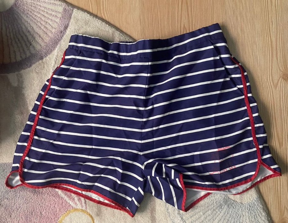 Renkli mavi-beyaz çizgili, pile detaylı bol kesim mini, yumuşak sentetik kumaştan üretilmiştir. Plaj için uygundur.