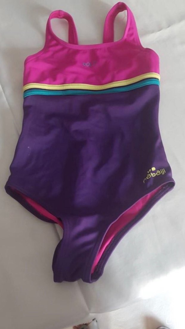 Mor ana renkli, renkli çizgili ve askılı kız çocuk mayo. Spor aktiviteleri için uygun, desensiz ve sade bir tasarıma sahip. ♀️