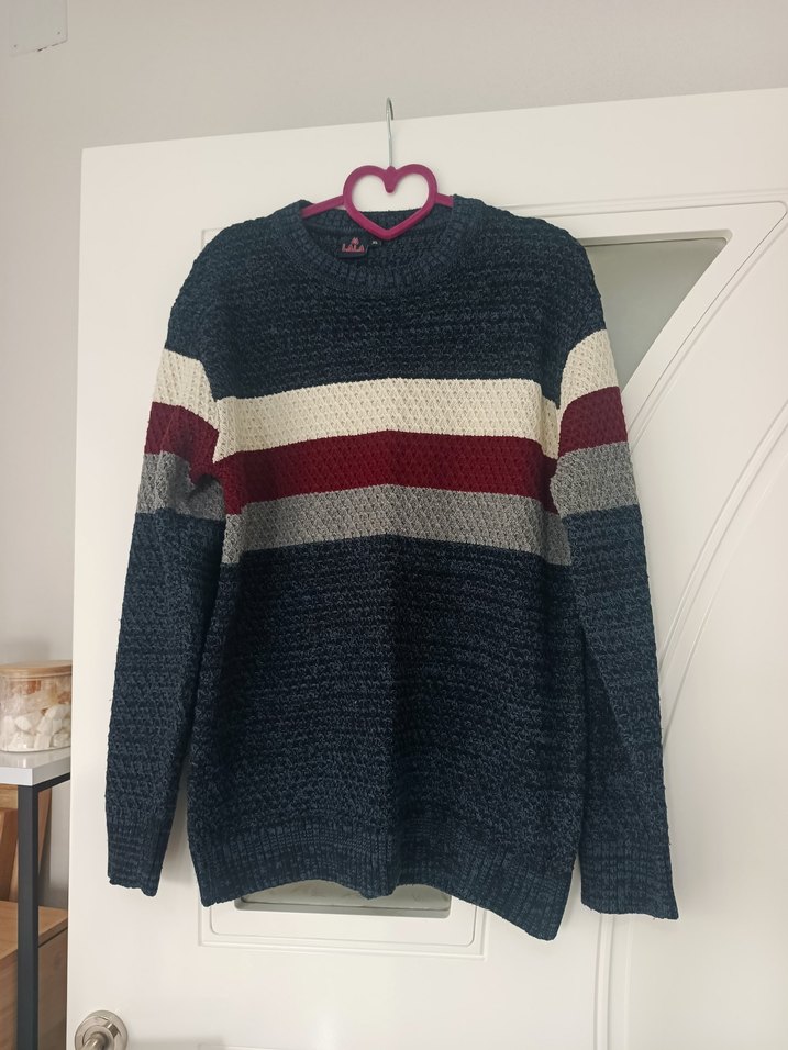 Örgü kumaştan yapılmış, uzun kollu ve yuvarlak yakalı erkek kazak. Renkli yatay çizgilerle rahat ve bol kesim, günlük kullanım için uygundur.