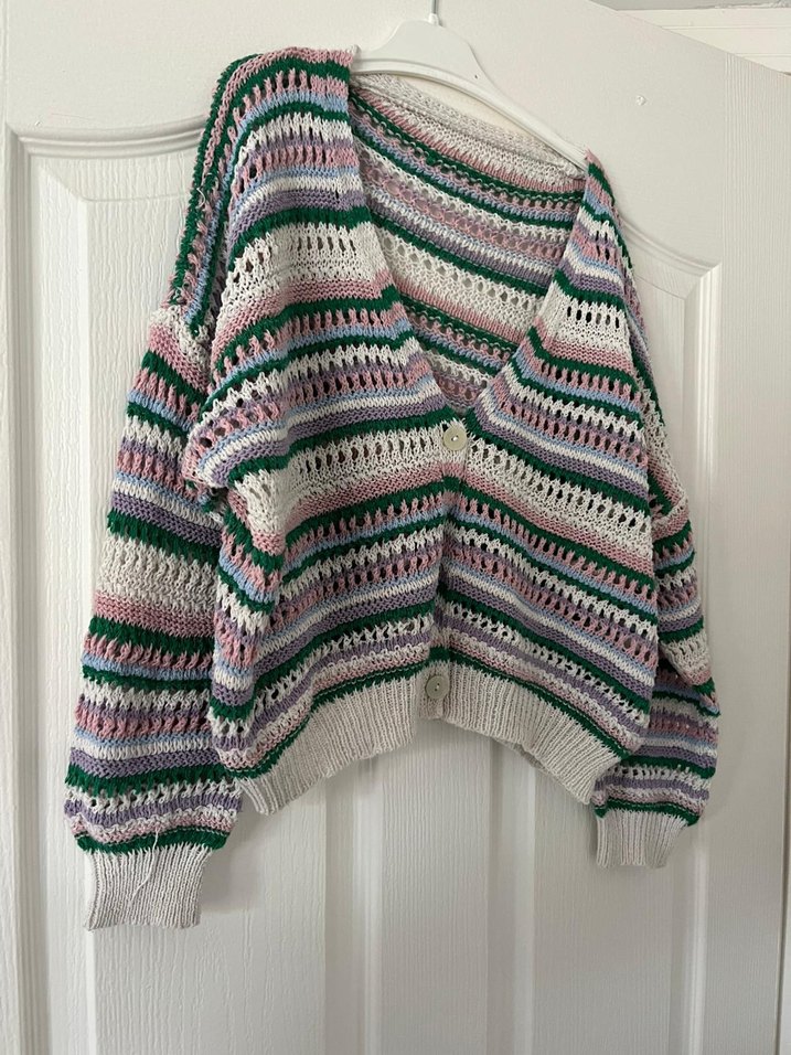 Bu kadın hırka, bol kesim, uzun kollu ve kayık yakalıdır. Pastel çok renkli çizgilerle örülmüş, günlük kullanıma uygun rahat ve bohem tarzda bir parçadır.