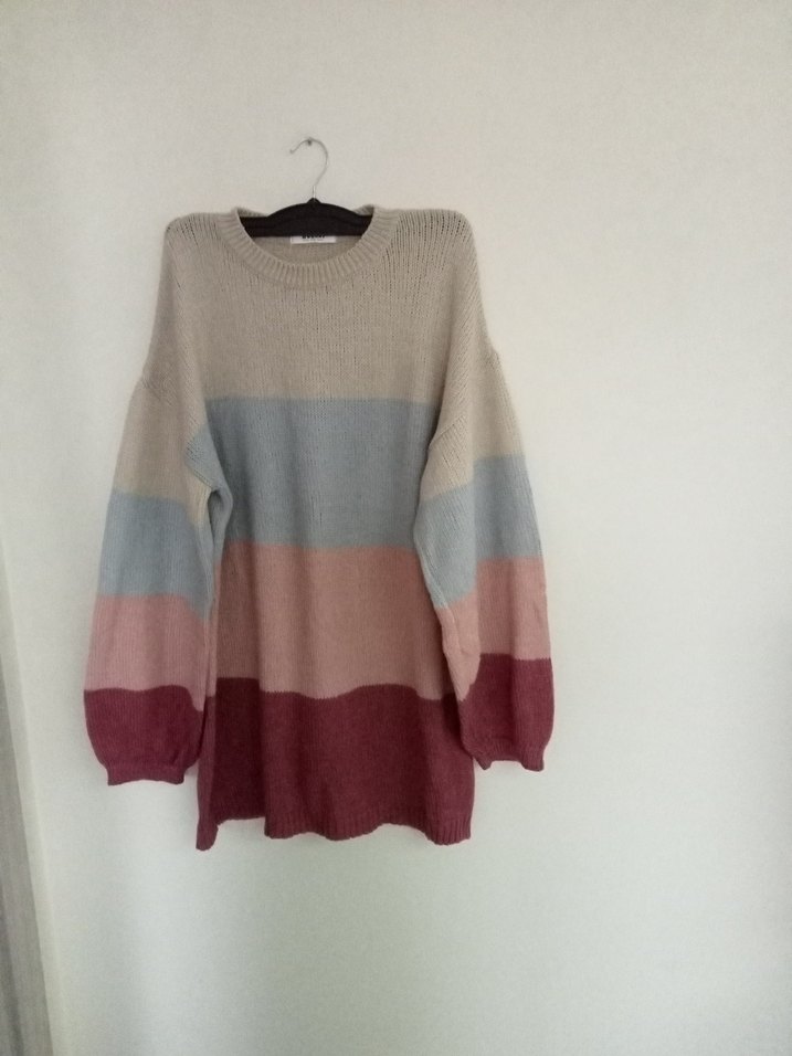 Kadınlar için renkli çizgili, uzun kollu, yuvarlak yakalı ve bol kesim örgü kazak. Pastel tonlarda rahat ve şık bir seçim. boy 90 cm iki koltuk arası 60 cm yumusacik balon kol kazak az giyildi sorunsuz dur