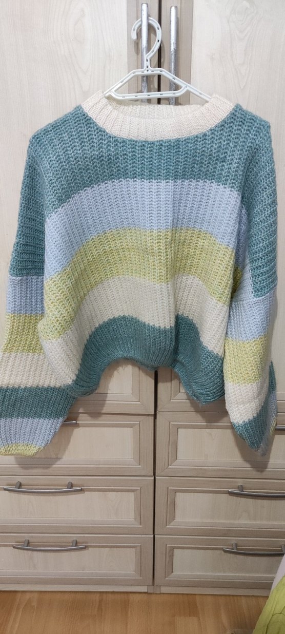 Kadınlar için renkli çizgili, pamuklu, uzun kollu, yuvarlak yakalı, rahat kesim örgü kazak. Günlük kullanım için bohem tarzda rahat ve şık.