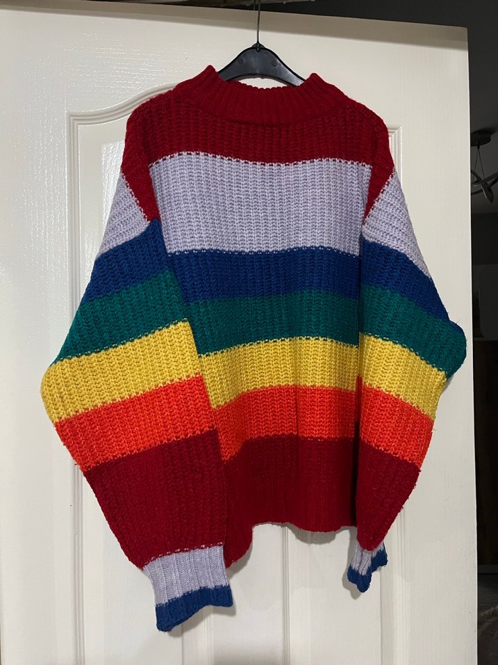 Renkli çizgili, uzun kollu ve gevşek kesim kadın kazak. Örgü kumaştan, bisiklet yaka ve rahat bohem tarzıyla günlük kullanıma uygun.