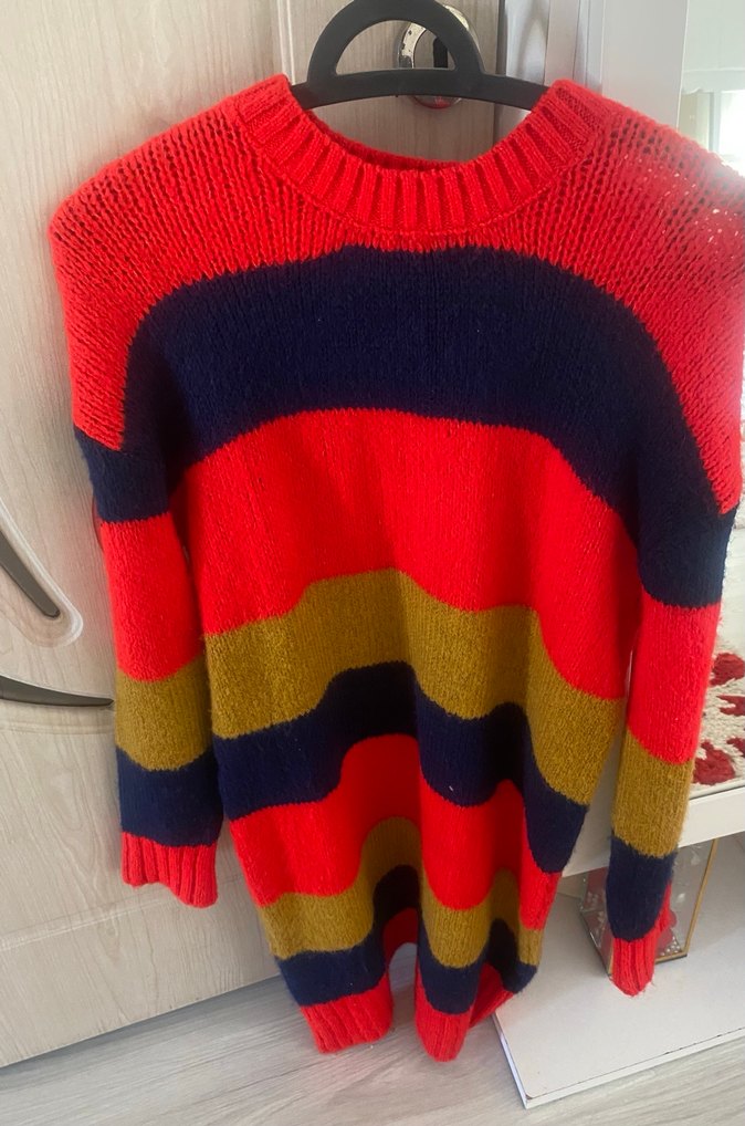 Renkli çizgili örme kumaştan, bol kesim ve uzun kollu kadın trikosudur. Yuvarlak yaka ve midi boy rahat tasarıma sahiptir.