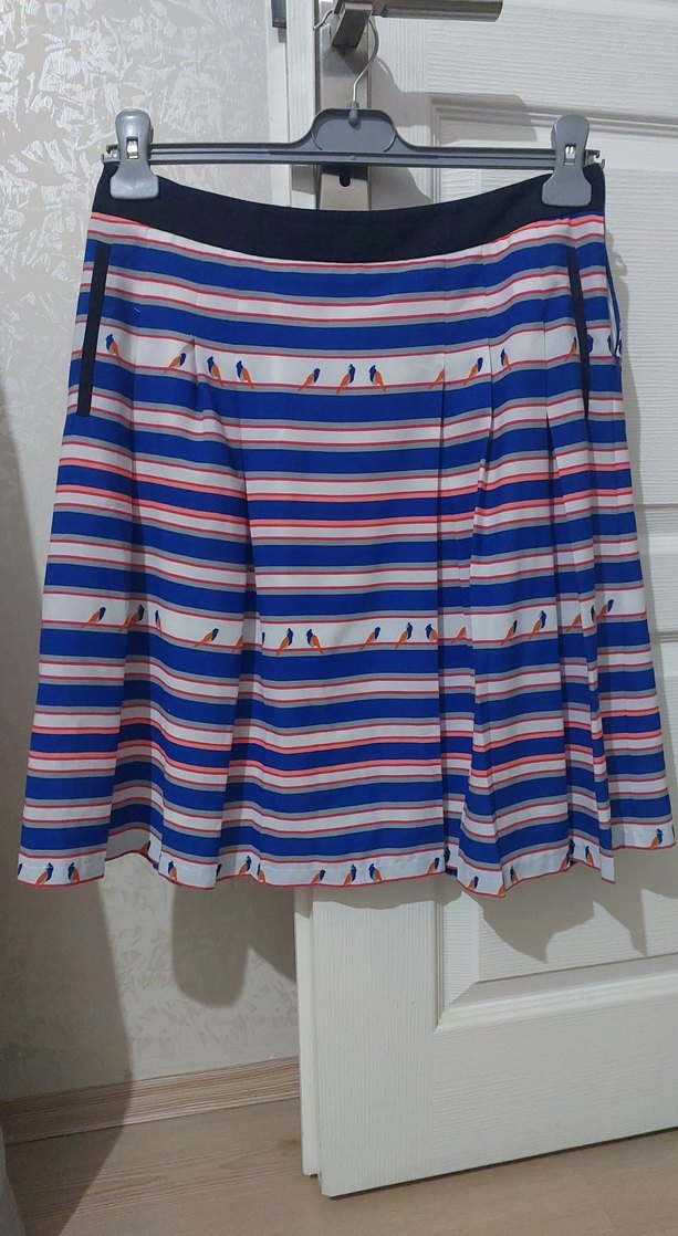 Renkli çizgili, pilili ve bol kesim mini etek. Sentetik kumaştan yapılmıştır, günlük sokak stiline uygundur.