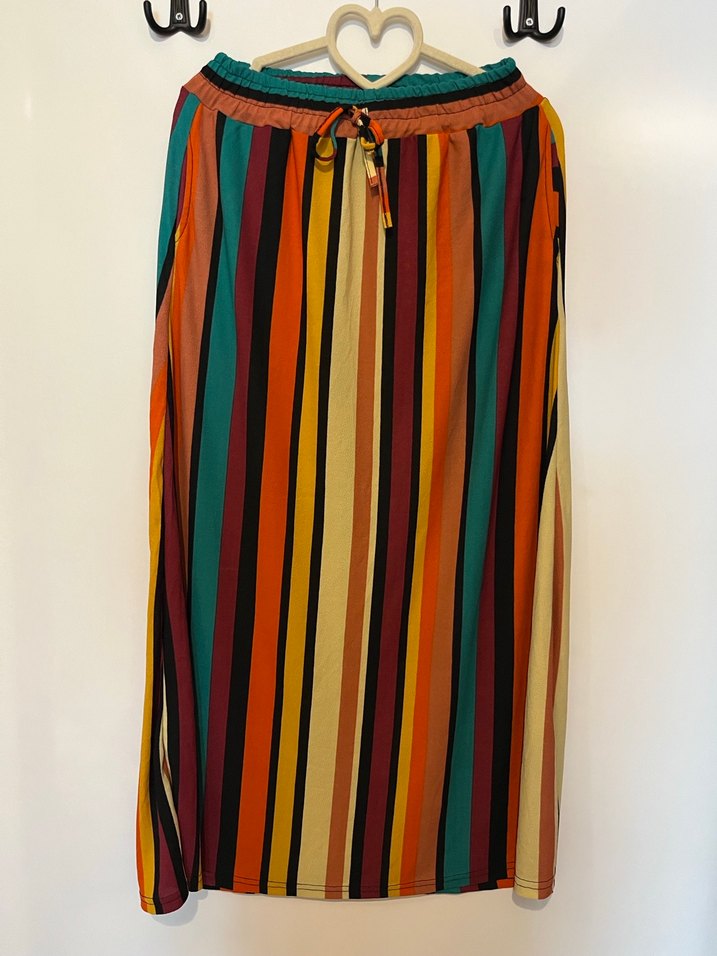 Renkli çizgili ve pilili uzun etek, yumuşak sentetik kumaştan, bol kesimle bohem tarzda rahat kullanım sağlar.
