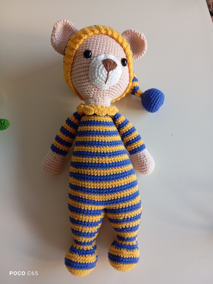 Sarı ve mavi çizgili örgü tasarıma sahip renkli peluş oyuncak, kapüşonlu ve ponponlu ayı şeklindedir. Yumuşak yapılıdır. taraftar uyku arkadaşı
