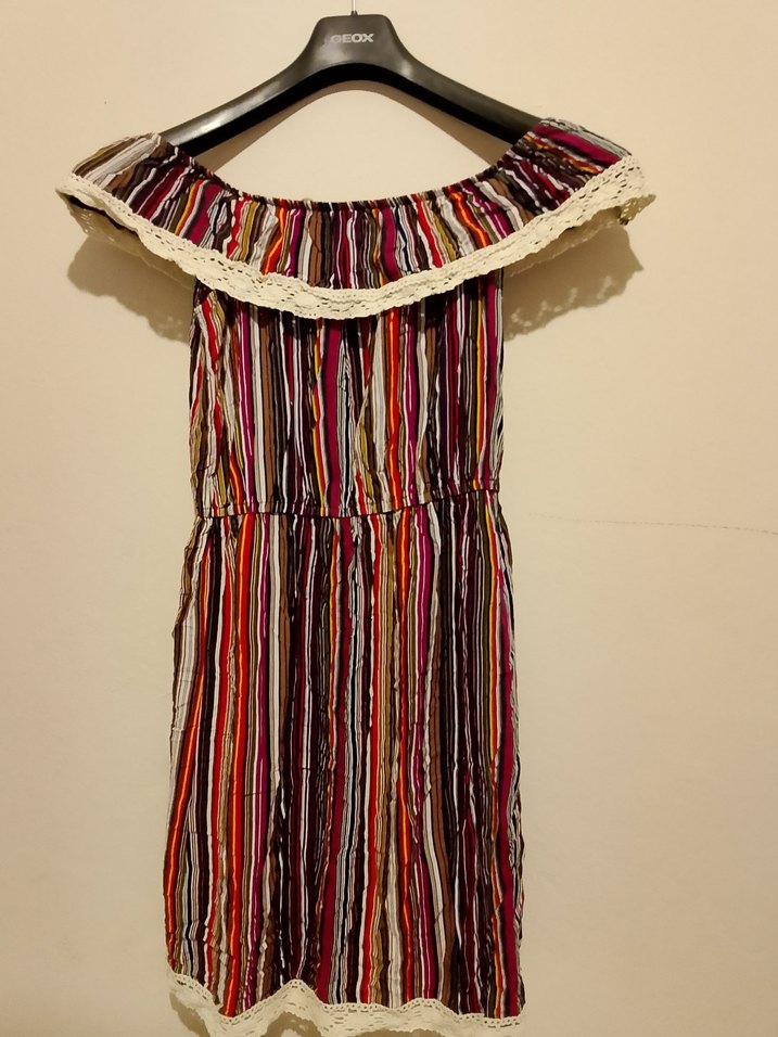Renkli çizgili mini elbise, straplez yaka ve fırfır detaylıdır. Salaş kesimli, kolsuz ve yumuşak kumaştandır.