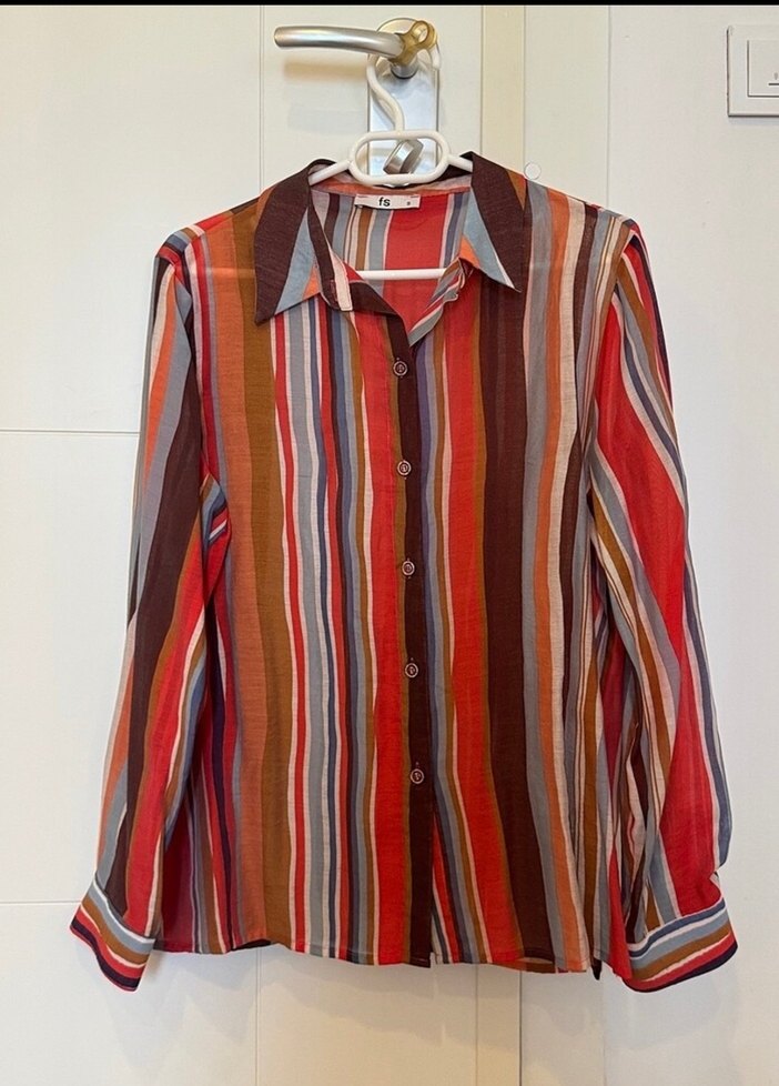 Renkli çizgili, uzun kollu, yakalı ve düğmeli, hafif keten kumaştan bol kesim gömlek.