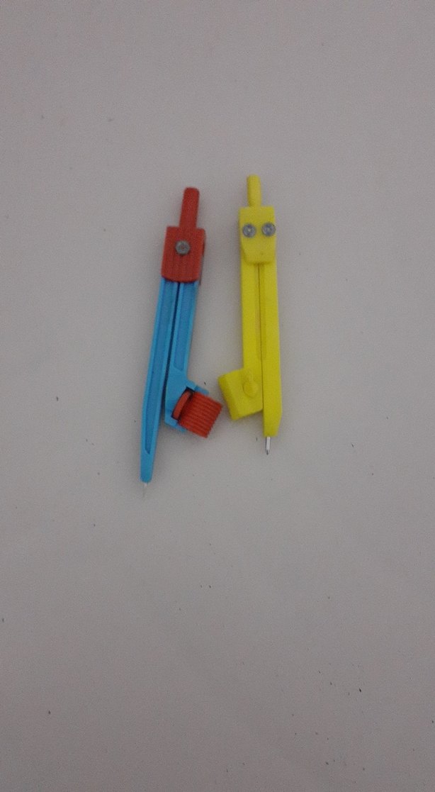 Ayarlanabilir kollara sahip, canlı mavi, kırmızı ve sarı renklerde renkli çizim pergelleri. 2 adet fiyatıdır.