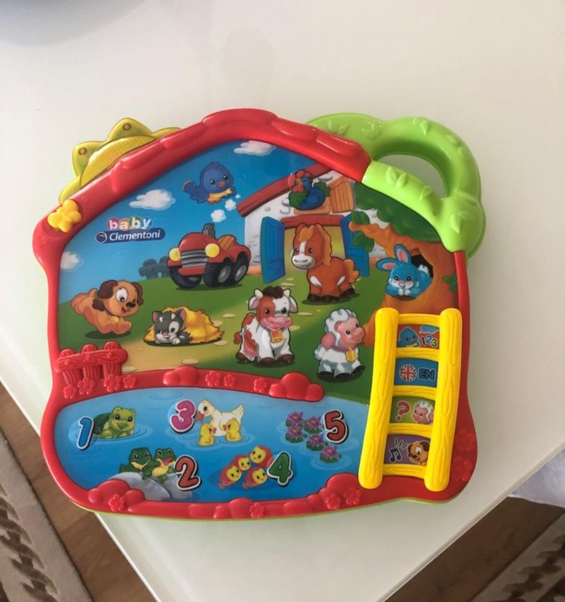 Clementoni'nun renkli eğitim oyuncağı, çiftlik hayvanları ve sayılar içerir. Kaydırmalı panel gibi etkileşimli bölümleri vardır.