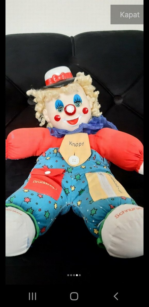 Çok renkli, yıldız desenli kıyafeti ve düğme detayları olan neşeli yüzlü palyaço bebek oyuncak. Kıvırcık saçlı ve şapkalı.