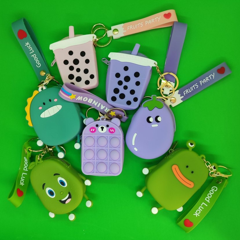 Renkli çocuk anahtarlıkları; bubble tea, patlıcan, kurbağa figürlü ve mor pop-it oyuncaklı, bileklikli modeller. Üzerinde 'FRUITSPART' ve 'FRUITSP' yazısı bulunur.