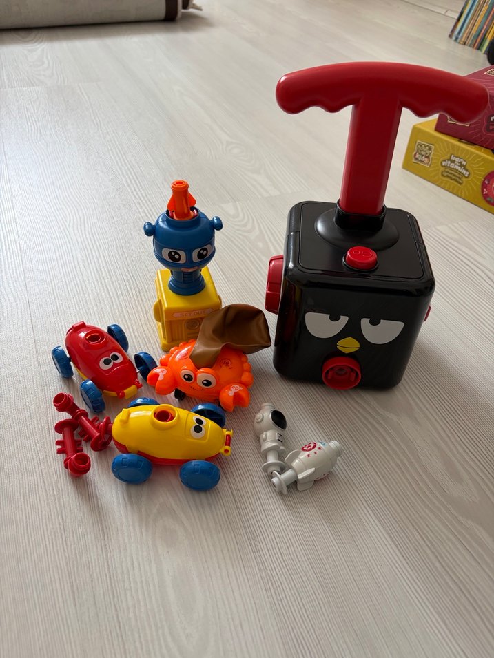 Çeşitli küçük figürler ve kırmızı saplı siyah kutudan oluşan renkli çocuk oyuncak seti. Canlı ve eğlenceli tasarım.