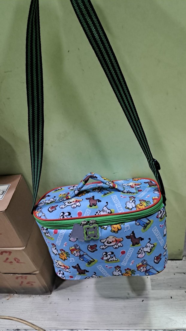 Renkli çocuk beslenme çantası, sevimli köpek desenleri ve yeşil fermuar içerir. Üstte kulp ve ayarlanabilir askıyla taşıması kolaydır. İçi alüminyum kaplıdır. 0 mağaza ürünüdür.